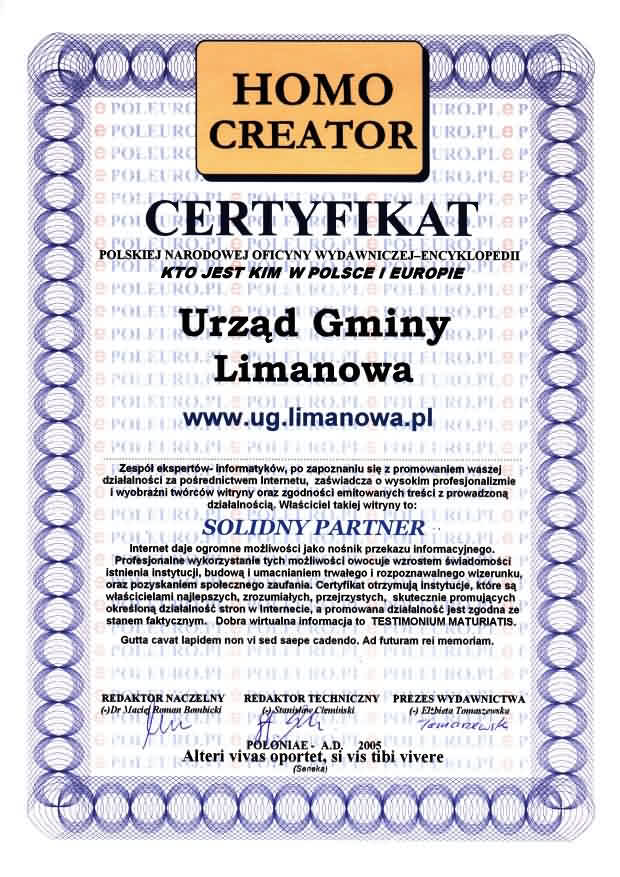 Polska Narodowa Oficyna Wydawnicza Encyklopedii "Kto jest kim w Polsce i Europie" przyznała witrynie Urzędu Gminy Limanowa Certyfikat oraz tytuł "Solidny Partner".
