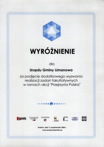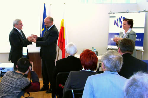 Certyfikat ukończenia kolejnego etapu akcji "Przejrzysta Polska" z rąk Pana Krzysztofa Lipskiego - dyrektora Małopolskiego Instytutu Samorządu Terytorialnego i Administracji oraz Pani Anny Hejdy - koordynatora akcji odebrał Pan Władysław Pazdan - Wójt Gminy Limanowa. Certyfikaty otrzymały również Urząd Miasta Nowego Sącza i Nowego Targu, Powiat Wielicki oraz Gmina Lanckorona.