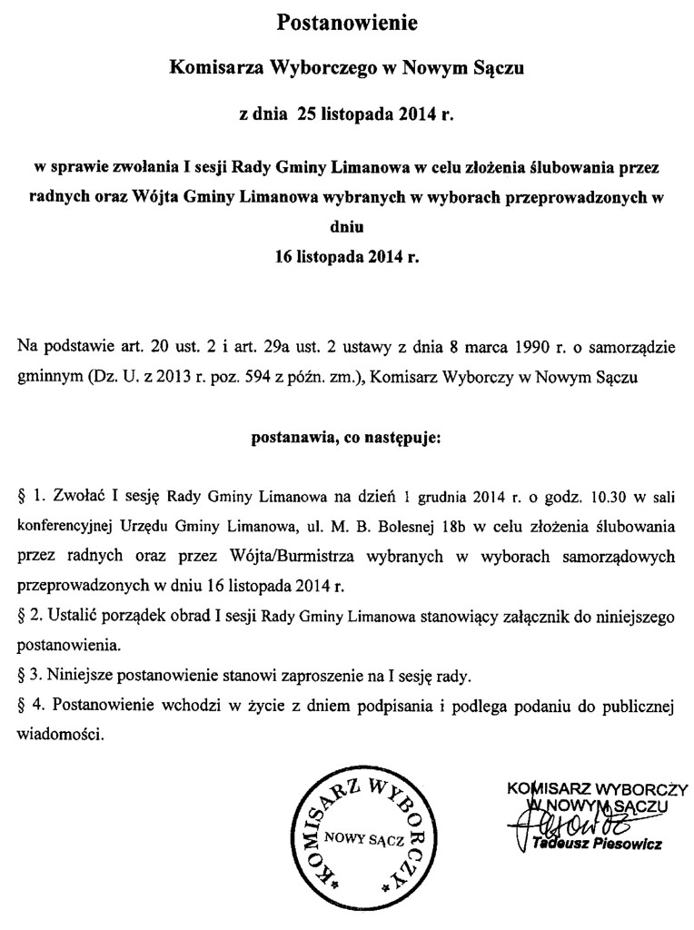 Porządek obrad I sesji Rady Gminy Limanowa