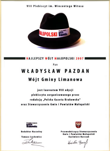 Wśród tych laureatów na piątym miejscu uplasował się nasz Wójt Gminy Władysław Pazdan, uzyskując już po raz piąty tytuł Najlepszego Wójta Małopolski.