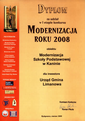 Gmina Limanowa za modernizację Szkoły Podstawowej w Kaninie uzyskała dyplom za udział w I etapie konkursu "Modernizacja Roku 2008".