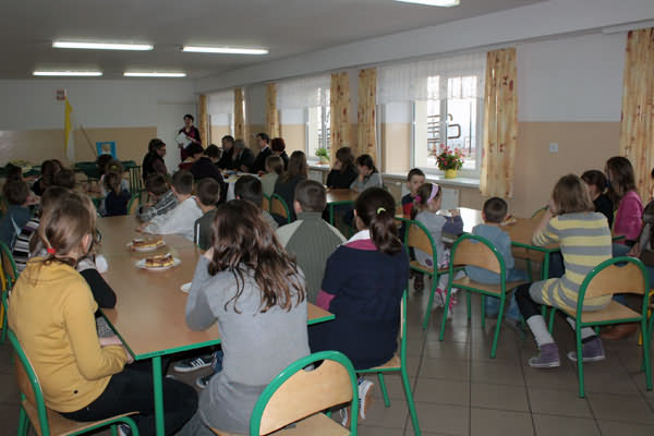 Uczestnicy spotkania wysłuchali krótkiego montażu muzyczno - literackiego przygotowanego przez uczennice klasy piątej. Na zakończenie goście dokonali pamiątkowego wpisu do Kroniki Gminnej Biblioteki Publicznej w Kaninie.