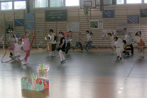 Efektem uczestnictwa uczniów w projektach była publiczna prezentacja ich rezultatów, podczas której uczniowie w kreatywny sposób zaprezentowali swoje umiejętności. Jako pierwsi wystąpili uczniowie klasy I realizujący II etap Projektu Edukacyjnego "Pierwsze uczniowskie doświadczenia drogą do wiedzy". Pierwszaki pod opieką mgr Małgorzaty Król zaprezentowały przedstawienie "Tele-ludek", pięknie recytując swoje role, śpiewając piosenki z akompaniamentem różnych instrumentów i wykonując układ taneczny. Uczniowie zaprezentowali również umiejętności ruchowe z wykorzystaniem akcesoriów sportowych. Chodzili na szczudłach, żonglowali talerzami, a także tańczyli z kołem przy muzyce. Z wielką radością pokazali jak wspaniałe i wesołe są dla nich zabawy ruchowe z użyciem barwnej chusty. Przedstawienie odbyło się w pięknej scenografii leśnej polany, uczniowie występowali w kolorowych, ciekawych kostiumach.