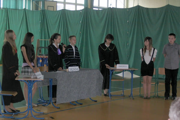Następnie działania projektowe zaprezentowali uczniowie gimnazjum. Przedstawili oni rezultaty następujących projektów: "Jak radzić sobie z agresją w szkole?, "Motoryzacja a ekologia", "Jak zmiany klimatu wpływają na życie człowieka?", "Czy autorytety są wśród nas?" Gimnazjaliści w ciekawej formie podsumowali realizację zadań projektowych; omówili spotkania z ciekawymi ludźmi; zaprezentowali wystawę ukazującą dokonania uczniów w poszczególnych dziedzinach; przedstawili wyniki ankiet, wytwory wykonane przez uczestników projektu np. Drzewo Życzeń, prace plastyczne, wiersze, hasła, artykuły do gazetki szkolnej. Pokazali interesujące prezentacje multimedialne oraz inscenizację "Sąd nad agresją". Całość spotkania uświetniły występy dwóch dziewczęcych grup cheerleaderek przygotowywanych przez mgr Magdalenę Dąbrowską, które w barwnych strojach niczym motyle zachwyciły widzów swoją zwinnością, wyczuciem rytmu i harmonią ruchów. Prezentacja rezultatów projektów bardzo się podobała zaproszonym gościom, docenili oni pomysłowość i zaangażowanie uczniów, i nauczycieli, Projekty miały zasięg szkolny i pozaszkolny w środowisku lokalnym.