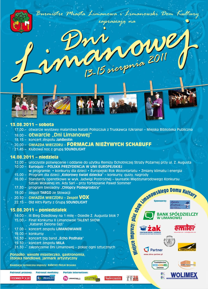 13-15 sierpnia Limanowa będzie obchodzić Święto Miasta tradycyjne Dni Limanowej, podczas których mamy nadzieję, każdy znajdzie coś dla siebie. Z myślą o mieszkańcach oraz wszystkich, którzy odwiedzą w tych dniach Limanową, organizatorzy przygotowali wiele atrakcji.