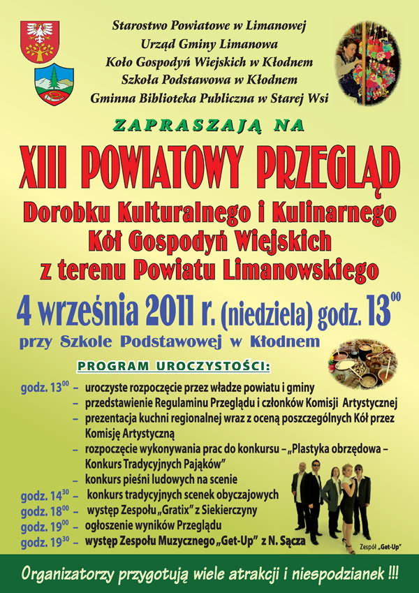 Organizatorami XIII Powiatowego Przeglądu Dorobku Kulturalnego i Kulinarnego Kół Gospodyń Wiejskich są: Starostwo Powiatowe w Limanowej, Urząd Gminy Limanowa, Koło Gospodyń Wiejskich w Kłodnem, Szkoła Podstawowa w Kłodnem oraz Gminna Biblioteka Publiczna w Starej Wsi.