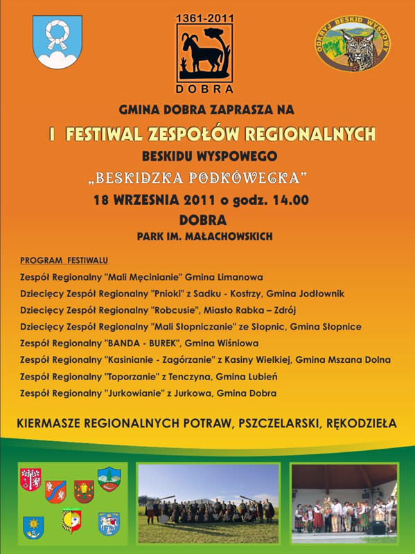W dniu 18 września br. w Dobrej odbędzie I Festiwal Zespołów Regionalnych Beskidu Wyspowego "Beskidzka Podkówecka 2011". Gminę Limanowa na Festiwalu reprezentować będzie Zespół Regionalny "Mali Męcinianie" z Męciny.
