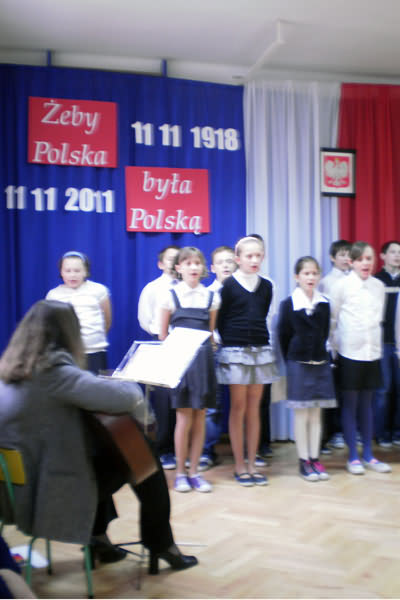 Uczniowie kl. IV-VI wykonali montaż słowno-muzyczny pt. "Żeby Polska była Polską", który przygotowany został przez Panią Barbarę Jajeśnicę i Panią Alinę Górszczyk. Szczególne wrażenie na wszystkich wywarły śpiewane pieśni patriotyczne, a zwłaszcza piosenka "Pytasz mnie". Z powagą i w podniosłym nastroju uczciliśmy tak ważne dla Polski wydarzenie. Była to wyjątkowa lekcja historii i patriotyzmu.