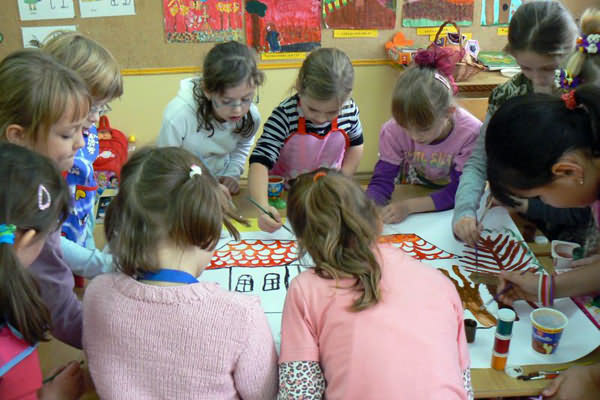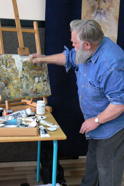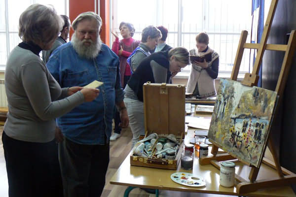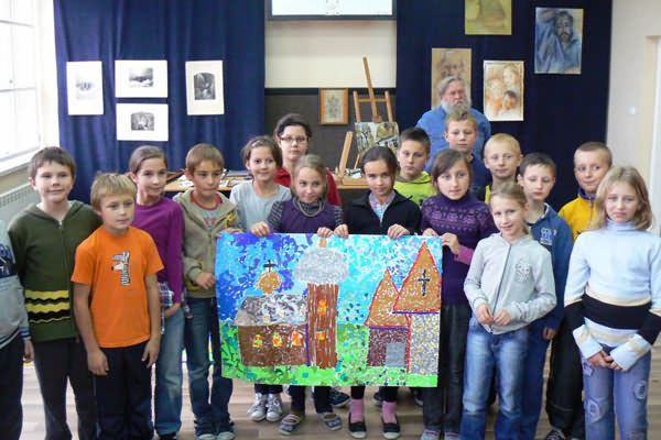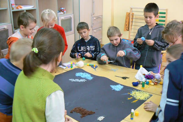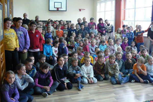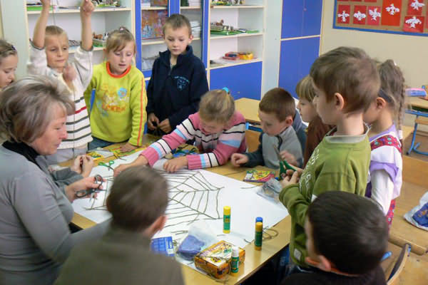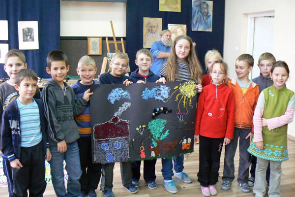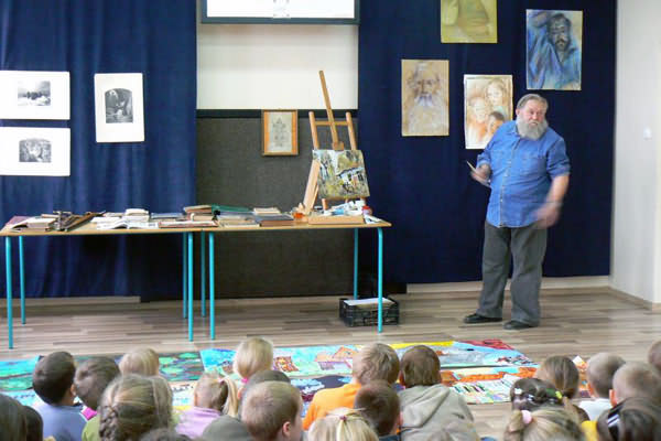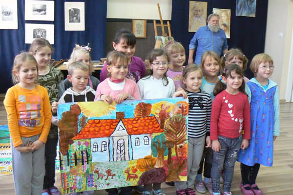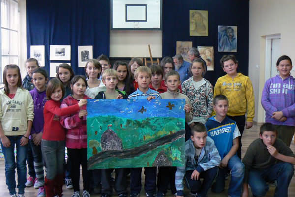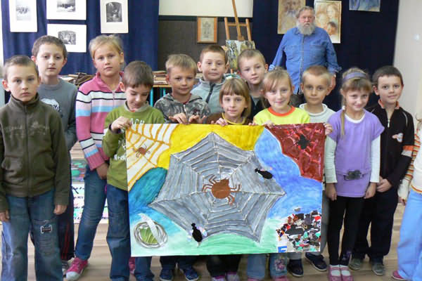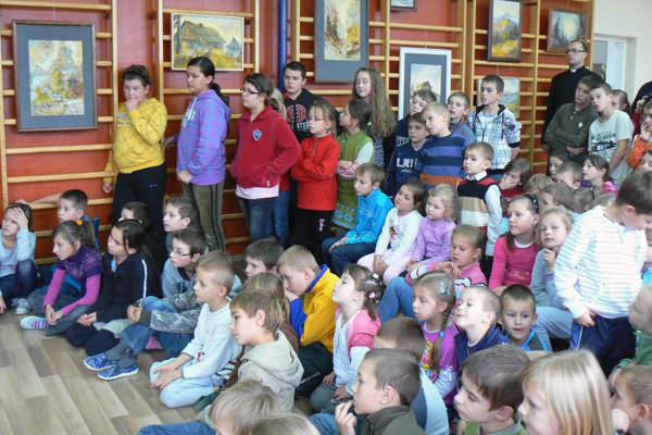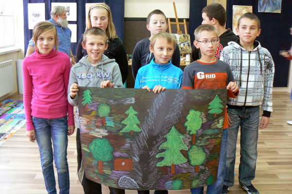 Po krótkim wykładzie dzieci miały za zadanie opracowanie w grupach w formie plastycznej poszczególnych tematów z zakresu historii regionu. Dzieci wykorzystały różnorodne techniki plastyczne i pracowały z wielkim zaangażowaniem, dzięki czemu powstały prace wyeksponowane następnie na sali gimnastycznej. Pan Zygmunt omówił krótko każdą z prac, a następnie zaprezentował sposoby malowania, jakie sam wykorzystuje w swojej pracy zawodowej. Na tym zakończyło się spotkanie z dziećmi.