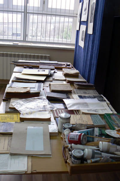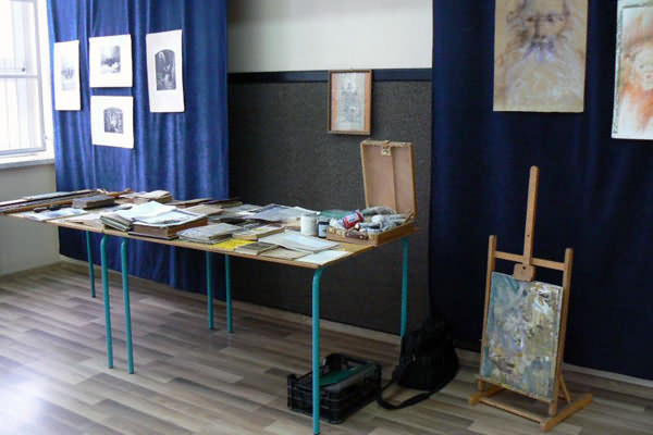 Następnie Pan Kłosowski przemienił salę gimnastyczną w małą galerię sztuki, gdzie wystawił swoje obrazy olejne, a także prace wykonane pastelami przez Jolantę Kłosowską - żonę Pana Zygmunta. Na stołach poukładał sporo zabytków związanych z historią i kulturą naszego kraju i regionu. Były tam między innymi: pisma ks. Wł. Smolenia dotyczące historii rozwoju ikonografii Matki Boskiej Królowej Polski, XVI- wieczna "klasówka", starodruki z XVII wieku, opracowania z XIX wieku dotyczące tutejszego regionu, rękopisy Kornela Makuszyńskiego, XVII- wieczny element ozdobny zbroi husarskiej, grafiki Grottgera o tematyce patriotycznej. Największe zaciekawienie uczniów wzbudził pistolet z epoki napoleońskiej.
