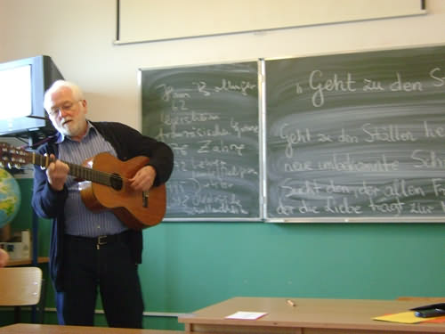 Podczas lekcji nasz gość z Niemiec opowiadał w języku niemieckim o sobie i swojej pracy oraz o zwyczajach w okresie adwentu i Bożego Narodzenia na terenie niemieckiego obszaru językowego. Gimnazjaliści przedstawili swoje umiejętności, prezentując dwie scenki tematyczne, które wzbudziły duże uznanie u naszego gościa. Potem przyszedł czas na naukę niemieckiej kolędy przy akompaniamencie gitary, z którą Hans nigdy się nie rozstaje.