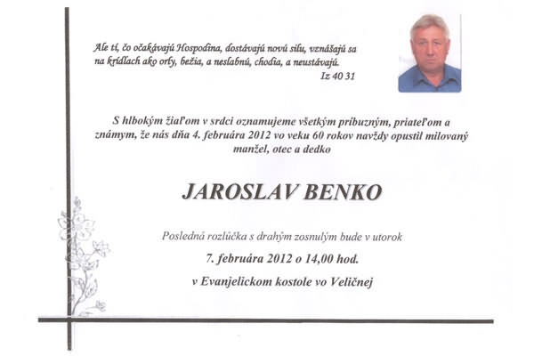 Jaroslav Benko był miłym i życzliwym, pełnym życia człowiekiem. Zostawił żonę, dwie córki oraz syna.