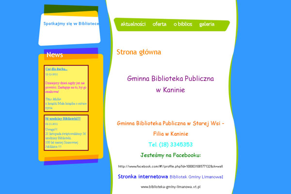 Serdecznie zapraszam na nową stronę internetową Gminnej Biblioteki Publicznej w Kaninie. Stronka funkcjonuje od niedawna, ale mam nadzieję, że stanie się użytecznym i popularnym źródłem informacji o placówce, z którego użytkownicy chętnie będą korzystać. Do dyspozycji czytelników jest 6 zakładek: "strona główna", "aktualności", "oferta", "o biblios", " galeria", "godziny otwarcia", " kontakt".