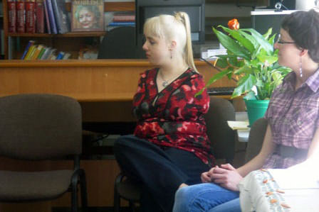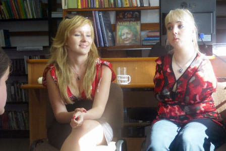 Na początek, nawiązując do tematyki spotkania, przybyli wysłuchali piosenki "Chodź, pomaluj mój świat" zespołu Dwa Plus Jeden, następnie głos zabrała artystka, opowiadając o swojej pasji - malarstwie, w bardzo barwny i ciekawy sposób. Pani Gosia jest osobą bardzo pogodną i optymistyczną, na pytanie, od kiedy maluje, odpowiedziała, że praktycznie od zawsze. Już jako małe dziecko rysowała szkice i próbowała swych sił w różnych technikach malarskich. Jak mówi sama, zamiłowanie do sztuki odziedziczyła w genach, gdyż w jej domu niemal każdy zajmuje się artyzmem: rzeźbą, malarstwem czy koronkarstwem. Zresztą malowanie to nie jedyna pasja pani Gosi, z powodzeniem pisze wiersze, piosenki i śpiewa.