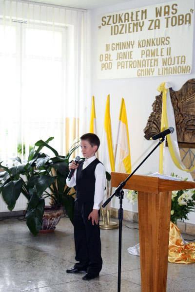 17 maja 2012 r. w Zespole Szkół nr 1 im. Jana Pawła II w Męcinie już po raz trzeci odbył się Gminny Konkurs o bł. Janie Pawle II pt. "Szukałem Was - idziemy za Tobą". Wzięło w nim udział 56 uczniów szkół podstawowych i gimnazjów, którzy reprezentowali 16 placówek oświatowych z terenu gminy Limanowa.