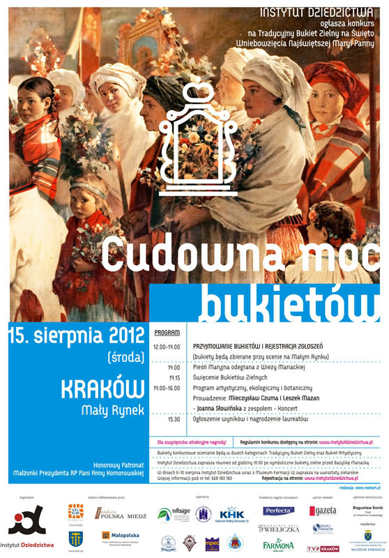 Instytut Dziedzictwa zaprasza wszystkich chętnych do wzięcia udziału w konkursie na tradycyjny bukiet zielny pn. "Cudowna moc bukietów", który odbędzie się w dniu 15 sierpnia br. na Małym Rynku w Krakowie. Honorowy patronat nad projektem objęła małżonka Prezydenta Rzeczypospolitej Polskiej Pani Anna Komorowska.