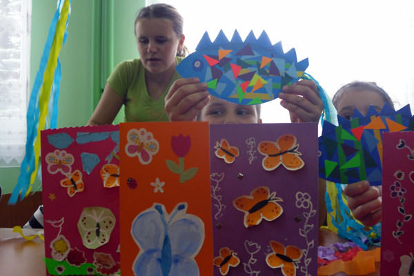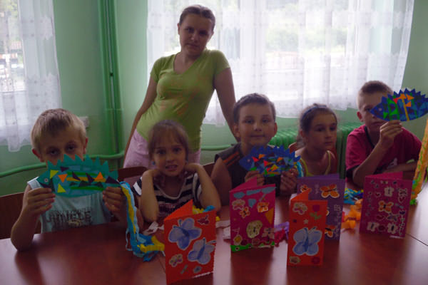 kartki z motywami kwiatów i motyli, natomiast chłopcy kolażowe rybki. Po artystycznym wysiłku, dla wszystkich małych plastyków przygotowany został słodki poczęstunek. Spotkanie przebiegało w miłej, luźnej i wakacyjnej atmosferze. Na koniec zrobiono wspólne, pamiątkowe zdjęcie.