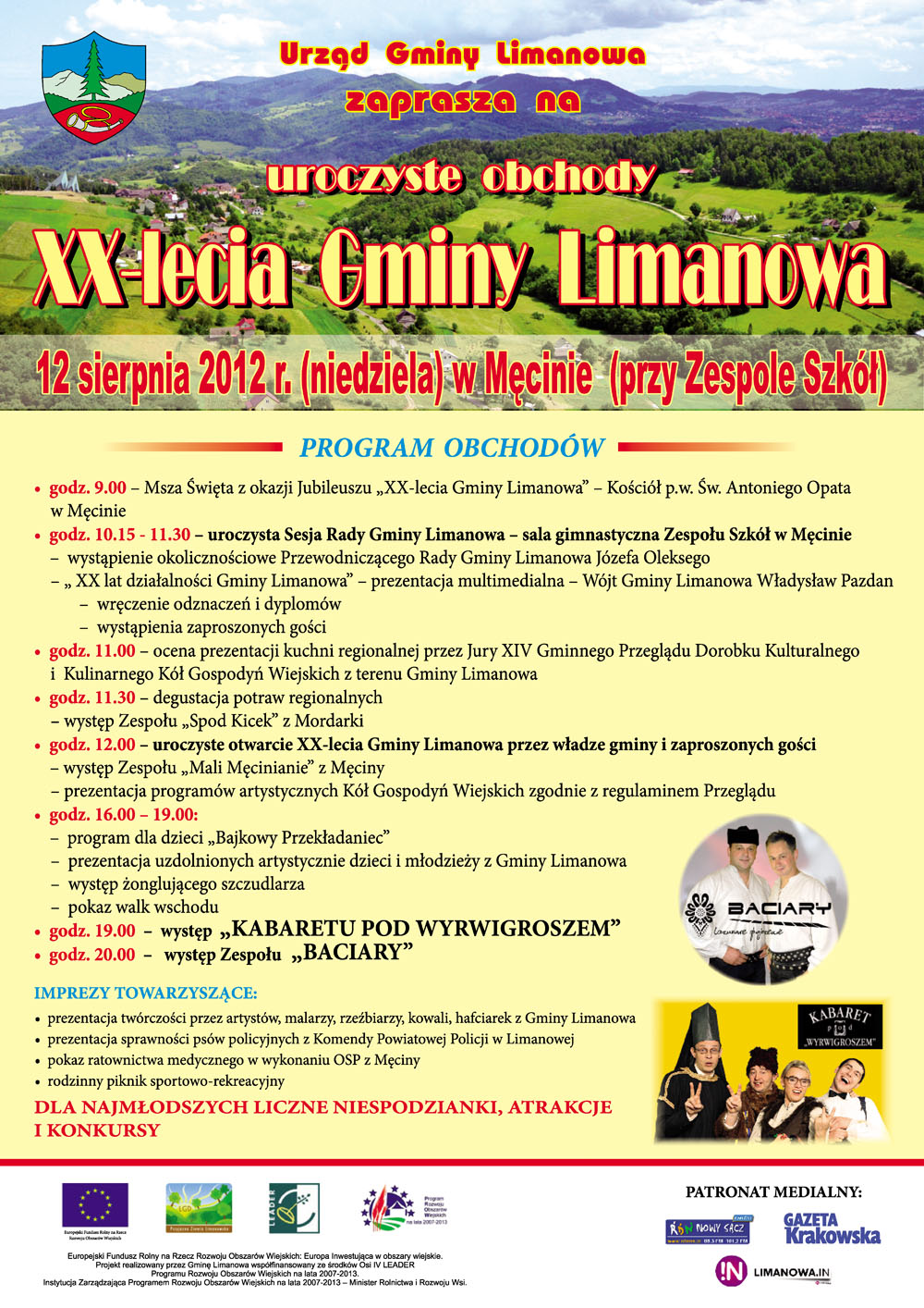 Serdecznie zapraszamy wszystkich mieszkańców gminy, turystów i gości na uroczyste obchody "XX-lecia Gminy Limanowa", które odbędą się 12 sierpnia br. przy Zespole Szkół w Męcinie