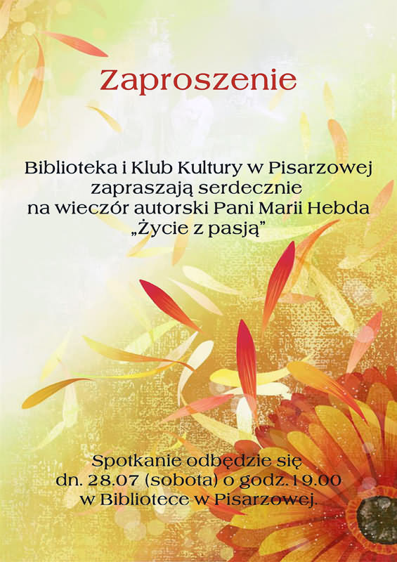 W dniu 28 lipca /sobota/ o godz. 1900 w Gminnej Bibliotece Publicznej i w Wiejskim Klubie Kultury w Pisarzowej odbędzie się wieczór autorski Marii Hebda pod wymownym tytułem "Życie z pasją".