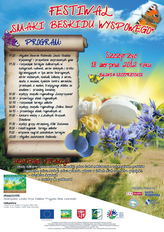 Stowarzyszenie Lokalna Grupa Działania "Przyjazna Ziemia Limanowska" serdecznie zaprasza w dniu 18 sierpnia br. na festiwal "Smaki Beskidu Wyspowego", który odbędzie się w miejscowości Szczyrzyc w Gminie Jodłownik. Impreza organizowana jest w ramach projektu współpracy pt. "Beskid Wyspowy i Gorce miejsca szczególnie inspirujące". Projekt współfinansowany jest ze środków Unii Europejskiej w ramach osi 4 LEADER - działanie 421 "Wdrażanie projektów współpracy" Programu Rozwoju