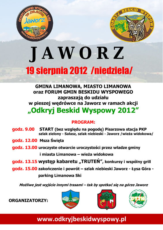 Gmina Limanowa, Miasto Limanowa oraz Forum Gmin Beskidu Wyspowego zapraszają do udziału w pieszej wędrówce na Jaworz w ramach akcji "Odkryj Beskid Wyspowy 2012".