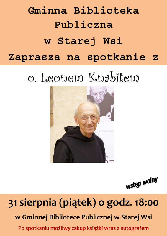 Gminna Biblioteka Publiczna w Starej Wsi zaprasza na spotkanie z o.Leonem Knabitem pt. "Benedyktyńska recepta na życie", które odbędzie się 31 sierpnia 2012 r. o godz. 18.00 w Gminnej Bibliotece Publicznej w Starej Wsi.