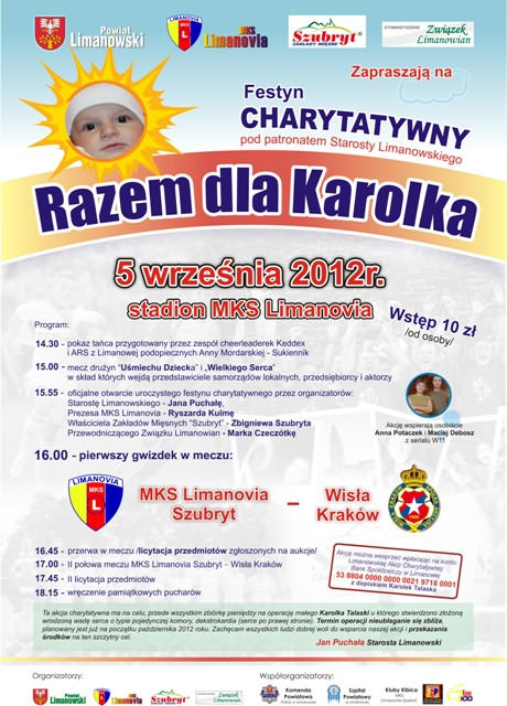 5 września br. na stadionie MKS Limanovia odbędzie się festyn charytatywny na rzecz Karolka Talaski. Tego dnia dla małego chłopca z wadą serca zmierzą się, m.in. Wisła Kraków z Limanovią - Szubyt. Pierwszy gwizdek sędziego zaplanowano na godz. 15-stą. Honorowy Patronat nad akcją objął Jan Puchała, Starosta Limanowski.
