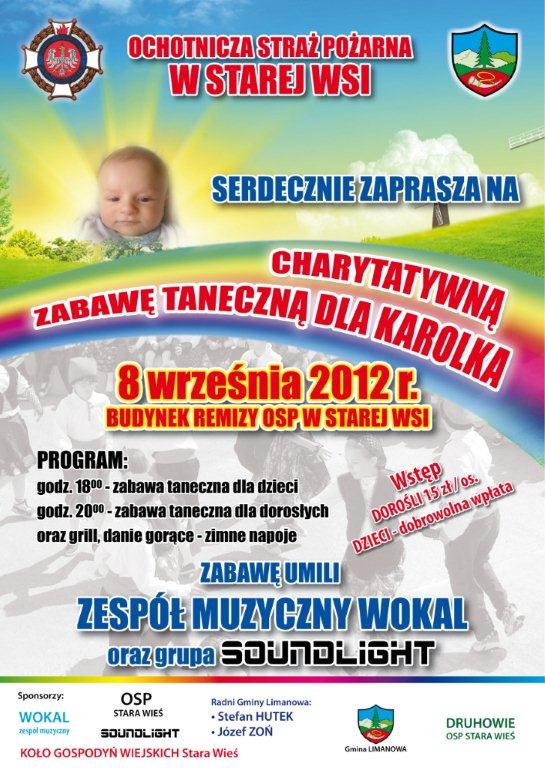W dniu 8 września br. w remizie OSP w Starej Wsi odbędzie się Charytatywna Zabawa Taneczna dla Karolka Talaski - małego chłopca, który urodził się z wadą serca. Inicjatorem przedsięwzięcia jest Ochotnicza Straż Pożarna w Starej Wsi.
