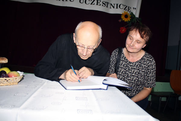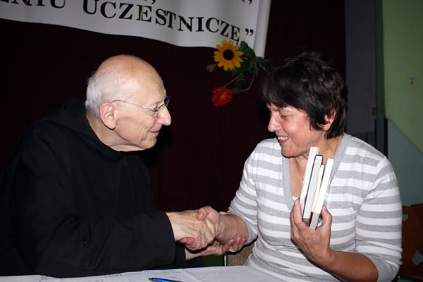 Spotkanie otworzył Jacenty Musiał - Dyrektor GBP w Starej Wsi, który przywitał przybyłych i przedstawił postać zakonnika. Ojciec Leon to tyniecka ikona, przyjaciel Ojca Świętego Jana Pawła II, autor wielu książek, w których zawarł refleksje nad ludzkim życiem i benedyktyńskim sposobem postrzegania świata. Ojca Leona cechuje niezwykła mądrość, umiejętność wsłuchiwania się w potrzeby ludzkie i traktowania każdego w indywidualny sposób. Zakonnik w niezwykle interesujący i barwny sposób przedstawił benedyktyńską receptę na szczęśliwe życie, opowiadał o Bogu, poszukiwaniu sensu życia, naturze człowieka i jego potrzebach. W dzisiejszym świecie pytania o sens istnienia są jednym z podstawowych zagadnień, na które odpowiedzi od zawsze stara się udzielić filozofia, religia i psychologia. Ludzie poszukują miłości, gdyż w głębi serca wierzą, iż tylko miłość może wypełnić ich życie i nadać sens zwykłej, szarej egzystencji. Dzięki miłości Boga, człowiek jest uzdolniony do miłości drugiego człowieka. Jak pisze Benedyktyn w swojej nowej książce "Kwiatki Ojca Leona" Miłości Boga możemy być pewni, nawet jeśli nasza miłość do Niego pozostawia wiele do życzenia. Bo Bóg kocha zawsze i każdego, bezwarunkowo i bezgranicznie. Ojciec Leon w swoje opowieści wplatał ciekawe anegdoty, zabawne zdarzenia i mnóstwo humoru. Najważniejszym przesłaniem, jakie przekazał, była prawda o wyjątkowości każdego z nas. Jak mówił skromny Benedyktyn nikt nie jest byle jaki, każdy jest jakiś. Ta prawda jest potrzeba szczególnie współczesnemu człowiekowi, zagubionemu, niedowartościowanemu, niewierzącemu we własne możliwości. Świadomość własnej wartości to lekarstwo na ludzkie kompleksy, załamania, depresje. Każdy jest kimś ważnym, niezwykłym, niepowtarzalnym, zasługującym na miłość i szczęście. Każdy jest kimś. Zakonnik podzielił się z nami radością benedyktyńskiej reguły, realizującą ideę naśladowania Chrystusa przez postępowanie pełne umiaru i umiłowanie Boga nade wszystko. Podczas spotkania uczestnicy mogli spróbować chleba, kołaczy i podpłomyków z domowego wypieku pani Kazimiery Piwowar z Męciny oraz sera, masła i innych produktów z Okręgowej Spółdzielni Mleczarskiej w Łososinie Górnej.