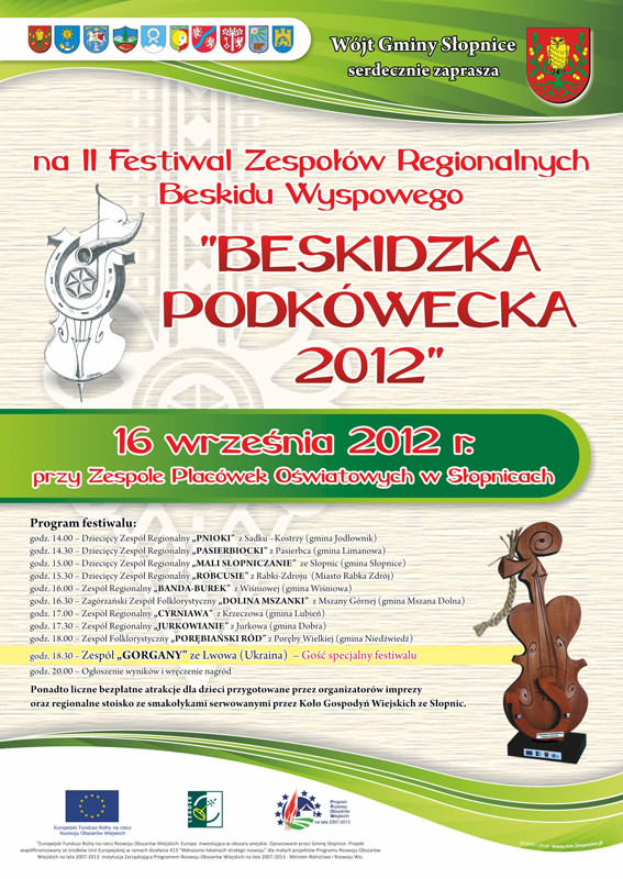 Wójt Gminy Słopnice serdecznie zaprasza na II Festiwal Zespołów Regionalnych "Beskidzka Podkówecka 2012", który odbędzie się w niedzielę 16 września br. przy Zespole Placówek Oświatowych w Słopnicach Dolnych. W konkursowym przeglądzie zespołów Beskidu Wyspowego zaprezentują się cztery zespoły dziecięce oraz pięć zespołów dorosłych. Gościem specjalnym festiwalu będzie zespół "Gorgany" ze Lwowa. Serdecznie zapraszamy do Słopnic!