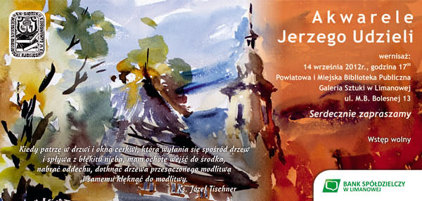 Czy malarstwo, które mamy przed sobą, wymaga słownego komentarza? Ideałem malarstwa jest przecież to, by obraz przemawiał sam za siebie, bez pomocy słów. Czy temu malarstwu potrzebne są słowa? - tak swego czasu o malarskiej twórczości pisał ks. Józef Tischner. W marcowym numerze "Echa Limanowskiego" pojawił się artykuł Stanisława Ociepki pt. "Limanowskie epizody Jerzego Udzieli" i niewątpliwie stał się on też przyczynkiem do uzupełnienia kalendarza imprez Miejskiej Galerii Sztuki w 2012 roku o tą właśnie wystawę. Jest to też nawiązanie do tradycji naszej Galerii, która przecież powstała z myślą o promowaniu twórczości ludzi związanych z Limanowszczyzną, a do takich należy zaliczyć Jerzego Udzielę - architekta, malarza, akwarelistę ... Czy temu malarstwu potrzebne są słowa? Zapraszamy, oceńcie państwo sami. - zachęca Joanna Michalik, Pełnomocnik Burmistrza Miasta ds. MBP.