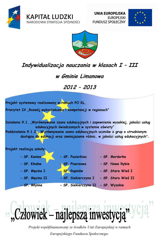 Wraz z rozpoczęciem roku szkolnego 2012/2013 Gmina Limanowa przystąpiła do projektu pn. „Indywidualizacja nauczania w klasach I-III w Gminie Limanowa” obejmującego wszystkie szkoły naszej Gminy.