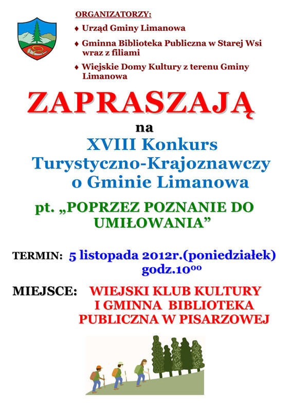 W dniu 5 listopada br. w Wiejskim Klubie Kultury i Gminnej Bibliotece Publicznej w Pisarzowej odbędzie się XVIII edycja Konkursu Turystyczno-Krajoznawczego o Gminie Limanowa pt. "Poprzez poznanie do umiłowania". Posiadane wiadomości o naszej "Małej Ojczyźnie" sprawdzać będą uczniowie ze szkół podstawowych i gimnazjów z terenu gminy.