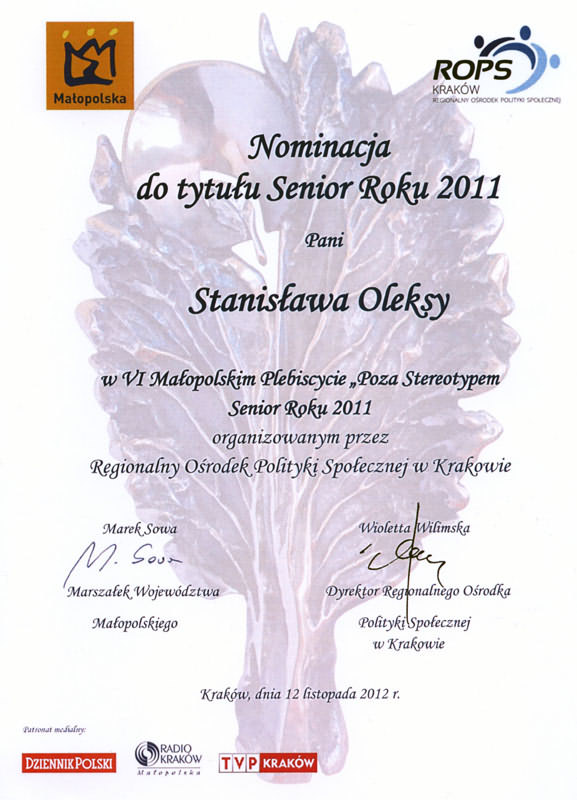 Seniorki oraz Seniora Roku 2011 otrzymali: Danuta Kleszowska z Krakowa oraz Henryk Kozubski z Wieliczki, a honorowe wyróżnienia: Zofia Puchelak z Krakowa, Teresa Święch z Myślenic, Tadeusz Feliks Siuda z Krakowa.