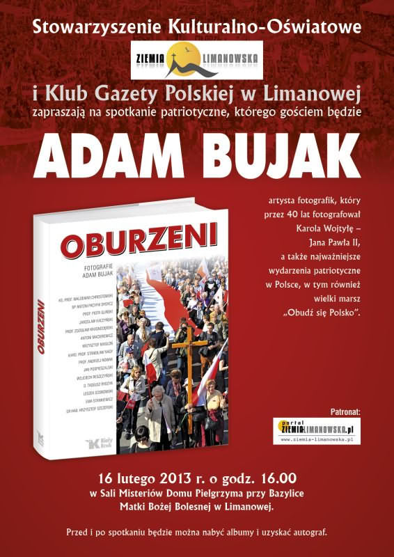 W dniu 16 lutego br. w Domu Pielgrzyma przy Limanowskiej Bazylice odbędzie się spotkanie z Adamem Bujakiem - znanym artystą, fotografikiem. Początek spotkania o godz. 16.00.