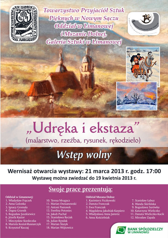 W najbliższy czwartek (21.03) o godzinie 17.00 w limanowskiej Miejskiej Galerii Sztuki wernisaż otwarcia wystawy członków Oddziałów Towarzystwa Przyjaciół Sztuk Pięknych z Limanowej i Mszany Dolnej. Swoje prace prezentuje aż 30 twórców, dlatego jesteśmy przekonani, że naprawdę każdy znajdzie coś ciekawego dla siebie. - zachęcają organizatorzy.