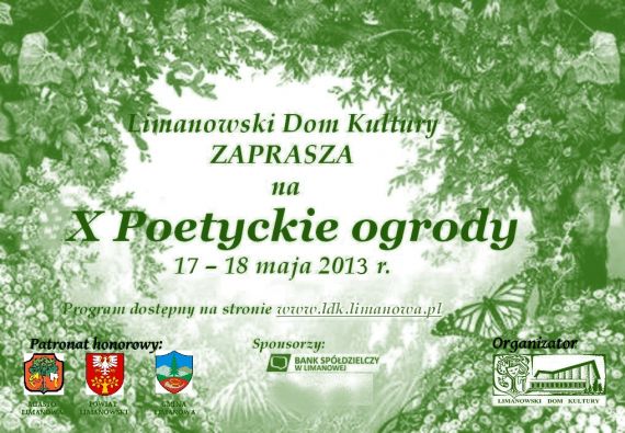 W dniach 17-18 maja 2013 r. w Limanowskim Domu Kultury odbywać się będzie kolejna edycja "Poetyckich Ogrodów". W programie zaplanowano m.in. spotkanie autorskie poetów, oraz koncert poetycko-muzyczny.