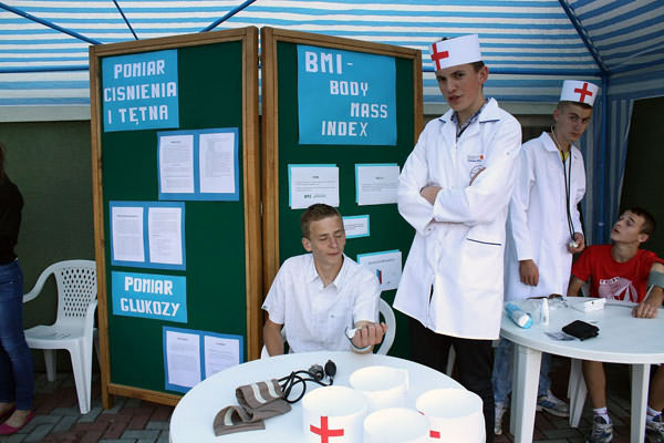 Jak przystało na Piknik Zdrowia, oprócz promowania aktywnego sposobu spędzania wolnego czasu, nie mogło również zabraknąć zdrowej żywności. Na kilku stoiskach rozstawionych wzdłuż szkoły można było degustować przeróżne smakołyki - sałatki owocowe i warzywne, kolorowe kanapki, a także soki ze świeżo wyciśniętych jabłek i marchewek, które znikały w mgnieniu oka. Cały czas działał również punkt pomiaru ciśnienia, tętna, glukozy i wskaźnika BMI. Gimnazjaliści, pod czujnym okiem pani pielęgniarki, sprawnie dokonywali pomiarów wszystkim chętnym uczniom, nauczycielom i rodzicom.