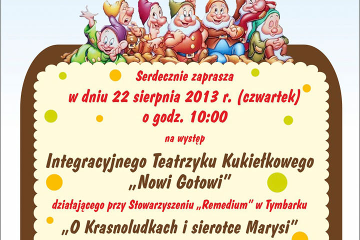 Gminna Biblioteka Publiczna w Starej Wsi - Filia w Nowym Rybiu serdecznie zaprasza wszystkie dzieci wraz z rodzicami na występ Integracyjnego Teatrzyku Kukiełkowego "Nowi-Gotowi", działającego przy Stowarzyszeniu "Remedium" w Tymbarku pt. "O Krasnoludkach i sierotce Marysi", który odbędzie się w dniu 22 sierpnia br. /czwartek/ o godzinie 10.00 w bibliotece w Nowym Rybiu.