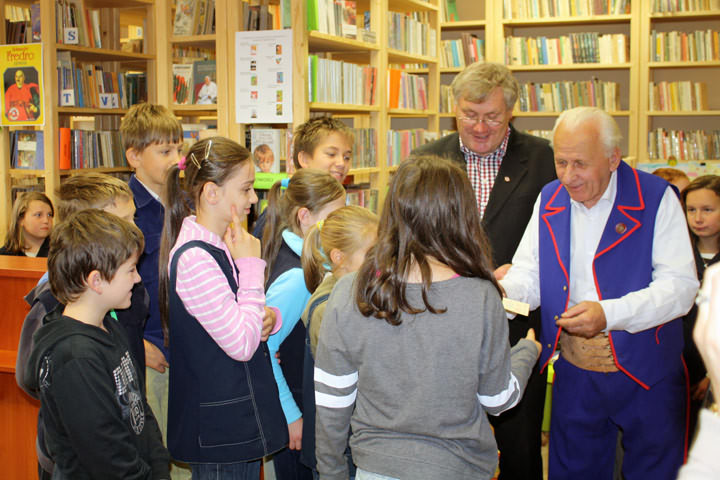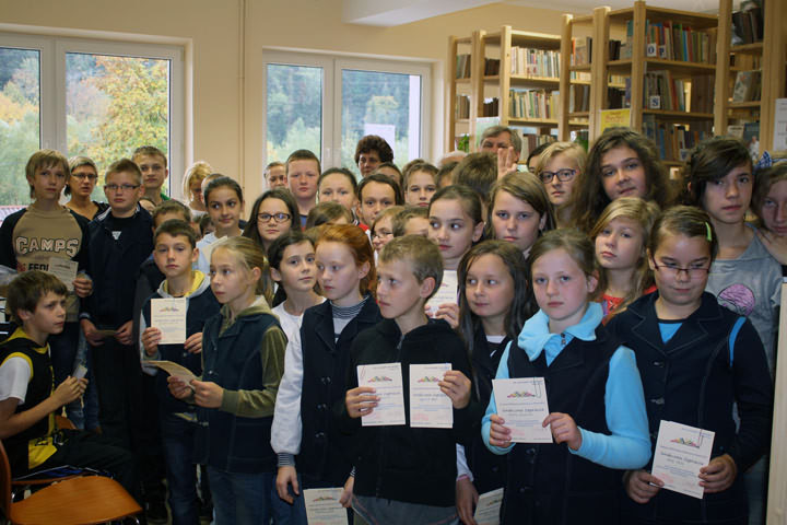 Następnie bibliotekarka Lidia Piegza przedstawiła historię biblioteki oraz zaznajomiła słuchaczy z księgozbiorem bibliotecznym. Zachęciła do odwiedzania czytelni komputerowej oraz czytelni czasopism, prezentując gromadzone tytuły wydawnictw ciągłych i dzienników codziennych. W placówce gromadzone są także regionalna: czasopisma lokalne, wycinki prasowe, wydawnictwa pisarzy z regionu. Na koniec Pani Lidia omówiła różnorodne formy pracy z dziećmi i młodzieżą, począwszy od konkursów plastycznych, recytatorskich poprzez gry i zabawy edukacyjne. Następnie wszyscy słuchacze otrzymali Kartę Czytelnika wraz z uroczystym, imiennym zaproszeniem do korzystania z oferty bibliotecznej i udziału w przedsięwzięciach kulturalnych.
