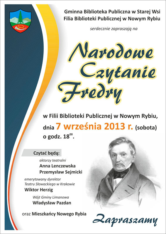 W Gminnej Bibliotece Publicznej w Nowym Rybiu. W sobotę 7 września 2013 roku, odbędzie się druga edycja ogólnopolskiej akcji "Narodowe Czytanie". Jest to zainicjowana w ubiegłym roku przez Prezydenta Bronisława Komorowskiego ogólnopolska kampania publicznego czytania największych polskich dzieł literackich. Tegoroczna akcja poświęcona jest twórczości Aleksandra Fredry, gdyż w tym roku przypada 220 rocznica jego urodzin.