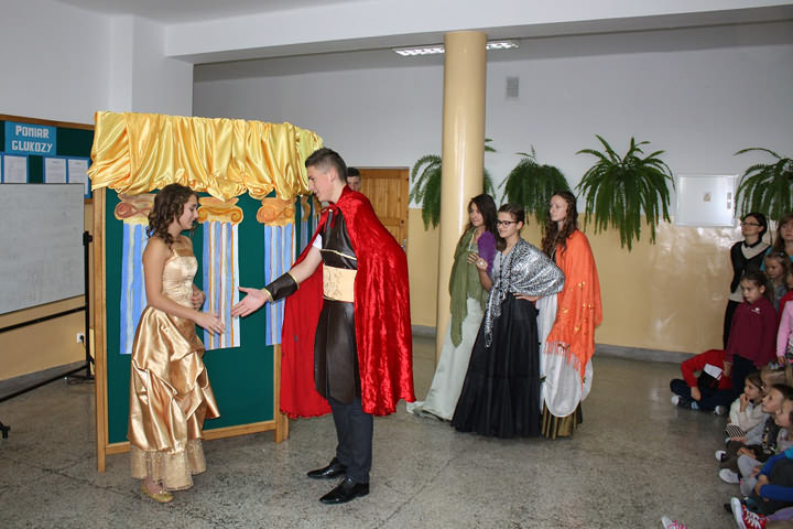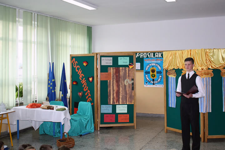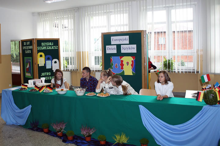W tym szczególnym dniu przygotowano wiele atrakcji dla wszystkich uczniów. Już na pierwszej lekcji pojawili się w klasach członkowie Klubu Europejskiego ze specjalną misją. Nauczali oni różnych języków, witając się po niemiecku, angielsku, włosku, hiszpańsku. Uczniowie siedzący w klasach zgadywali z jakiego kraju pochodzą dane osoby ubrane w barwy flag poszczególnych państw. Uczniowie chętnie uczyli się nowych słówek w różnych językach. Na drugiej lekcji członkowie Koła Języka Niemieckiego przedstawili „Kopciuszka” w języku niemieckim. Po przedstawieniu odbył się także konkurs językowy. Przez cały dzień czynny był „sklepik europejski”, a na przerwach słychać było piosenki w różnych językach. Uczniowie i nauczyciele Zespołu Szkół nr 1 w Męcinie dbają o to, by w szkole zawsze „coś się działo” i tak też jest. Zaangażowanie uczniów widać na każdy dzień, a rezultatem pracy pozalekcyjnej są właśnie takie dni jak ten, kiedy młodzież może zaprezentować swoje talenty.