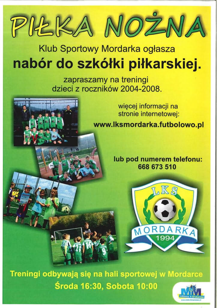 Klub Sportowy Mordarka ogłasza nabór do szkółki piłkarskiej .Klub zaprasza również na treningi dzieci roczników 2004 - 2008.