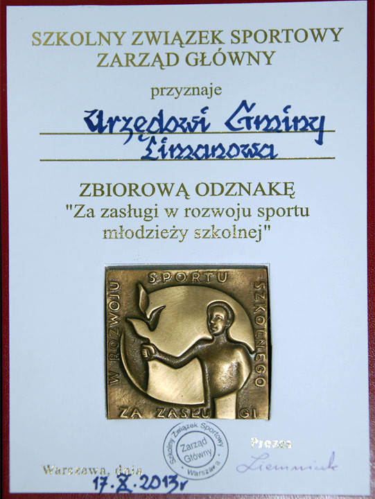 Odznakę za "Zasługi w rozwoju sportu młodzieży szkolnej" otrzymał Urząd Gminy Limanowa podczas uroczystości Jubileuszu 60-lecia Szkolnego Związku Sportowego, która odbyła się dnia 17 października br. w Wieliczce. W uroczystości zorganizowanej przez Małopolski Szkolny Związek Sportowy, przy współpracy z wielickim samorządem wzięło udział blisko 500 osób.