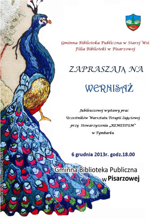 Gminna Biblioteka Publiczna w Starej Wsi oraz Filia Biblioteki Publicznej w Pisarzowej serdecznie zapraszają w dniu 6 grudnia br. o godz. 18.00. na Wernisaż Jubileuszowej Wystawy Prac Uczestników Terapii Zajęciowej działających przy Stowarzyszeniu „Remedium’’