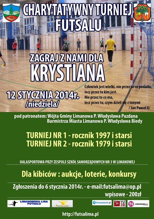 W dniu 11-12.01.2014r. w ZSS nr 3 w Limanowej jak co roku Limanowska Liga Futsalu organizuje kolejny, piaty już Turniej Charytatywny z cyklu „Zagraj z nami dla".