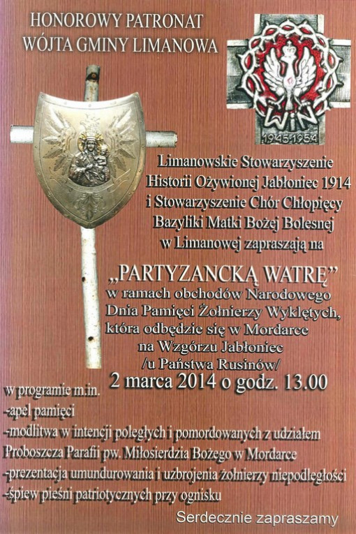 Dnia 2 marca br. w Mordarce, na wzgórzu Jabłoniec odbędzie się Partyzancka Watra - Lekcja Historii Ożywionej, przygotowana przez Limanowskie Stowarzyszenie Historii Ożywionej Jabłoniec 1914. Historyczno-edukacyjne przedsięwzięcie organizowane jest celem upamiętnienia Narodowego Dnia Pamięci „Żołnierzy Wyklętych"