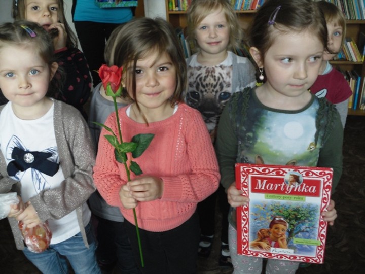 Również dzieci z przedszkola im. Kubusia Puchatka odwiedziły Bibliotekę Publiczną w Męcinie. Nie była to pierwsza wizyta małych czytelników, gdyż biblioteka współpracuje z przedszkolem od kilku lat. Tym razem okazją do odwiedzin były obchody Małopolskich Dni Książki - „Książka i Róża”. Program z tej okazji został przygotowany przez starsze koleżanki. Przedszkolaki chętnie rozwiązywały zagadki, śpiewały piosenki i słuchały wierszy. Mali czytelnicy z ciekawością sięgali po nowe książki, wiele nowości wypożyczono do przedszkola. Na zakończenie spotkania, tradycyjnie dzieci otrzymały książkę i różę.