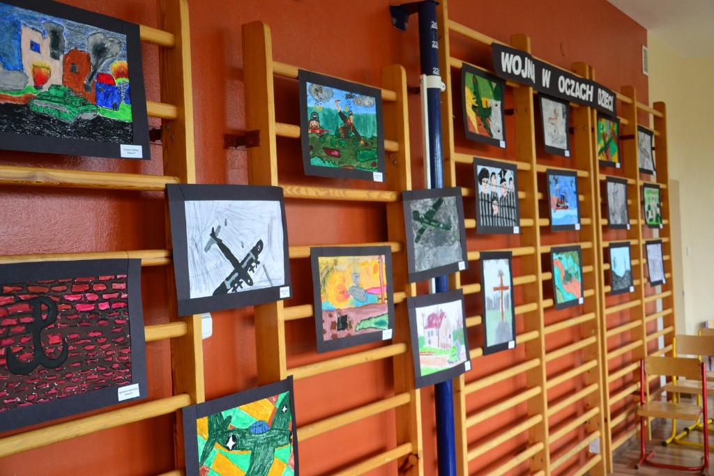 Dekoracji dopełniała wystawa prac plastycznych uczniów kl. IV-VI pt. „Wojna w oczach dzieci”, która miała charakter konkursu a komisja konkursowa w osobach Pani Karoliny Giercuszkiewicz, Pani Ewy Jabłońskiej oraz Pani Małgorzaty Karabin przyznała następujące nominacje: