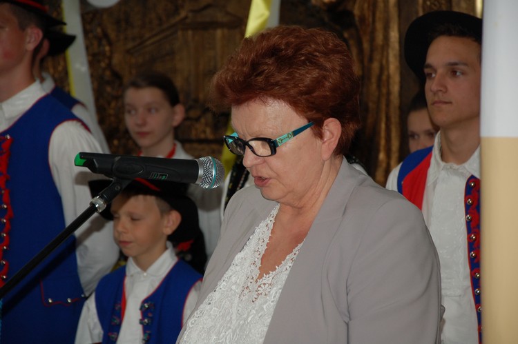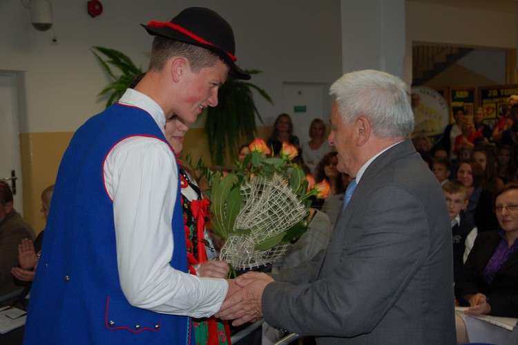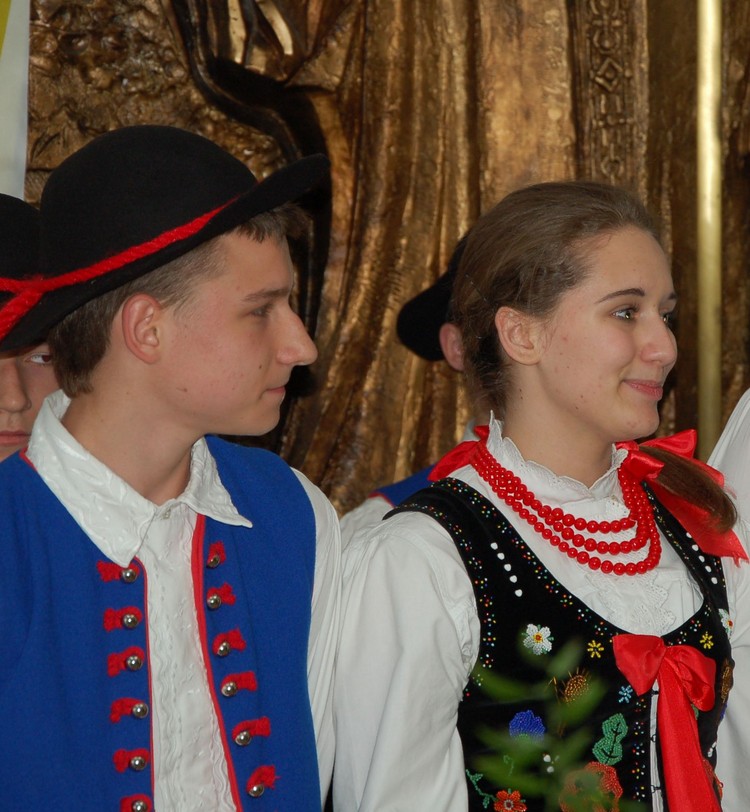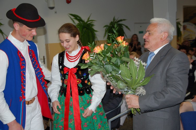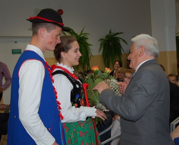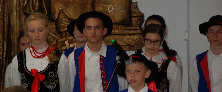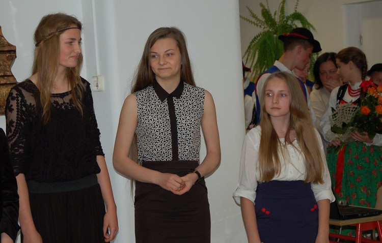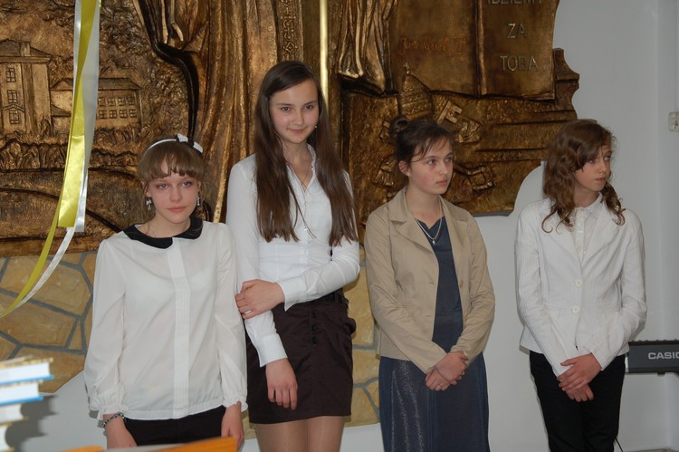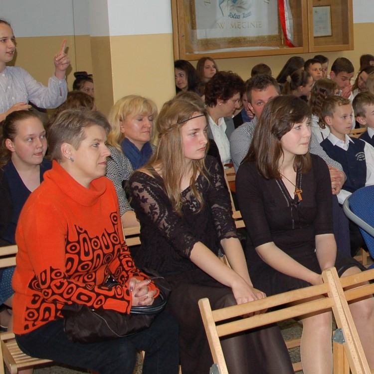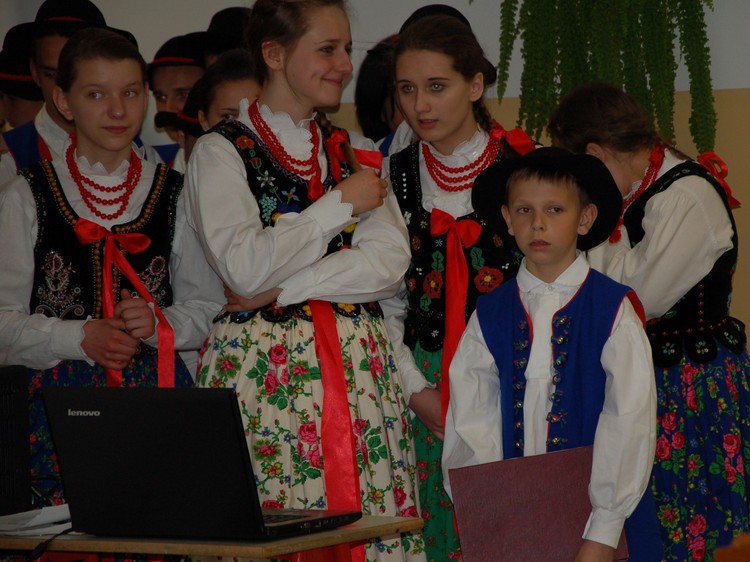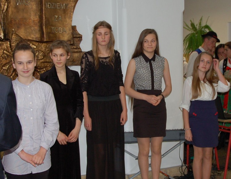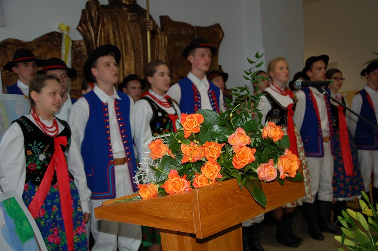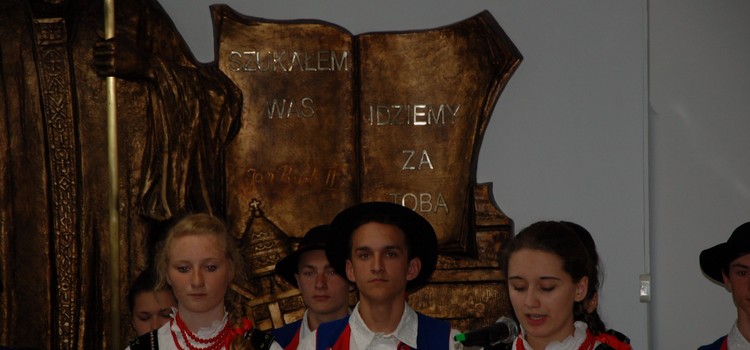 Uroczystość rozdania nagród swoim występem uświetnili członkowie Zespołu Regionalnego „Mali Męcinianie”. Młodzież zaprezentowała montaż słowno – muzyczny, na który złożyły się pieśni związane z Ojcem Świętym oraz autorskie wiersze uczniów naszej szkoły, będące pokłosiem działań wychowawczych podejmowanych wokół patrona.